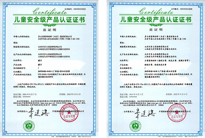 多士居装饰材料 (北京) 集团有限公司作为绿色生态涂装领域的创新引领者,近日其旗下腻子与石膏系列产品正式通过中国国检测试控股集团股份有限公司(CTC 国检集团)权威认证,荣获 "儿童安全级产品" 认证证书。这一突破不仅标志着多士居在环保建材研发领域的技术升级,更彰显了其以儿童健康为核心的产品开发理念。